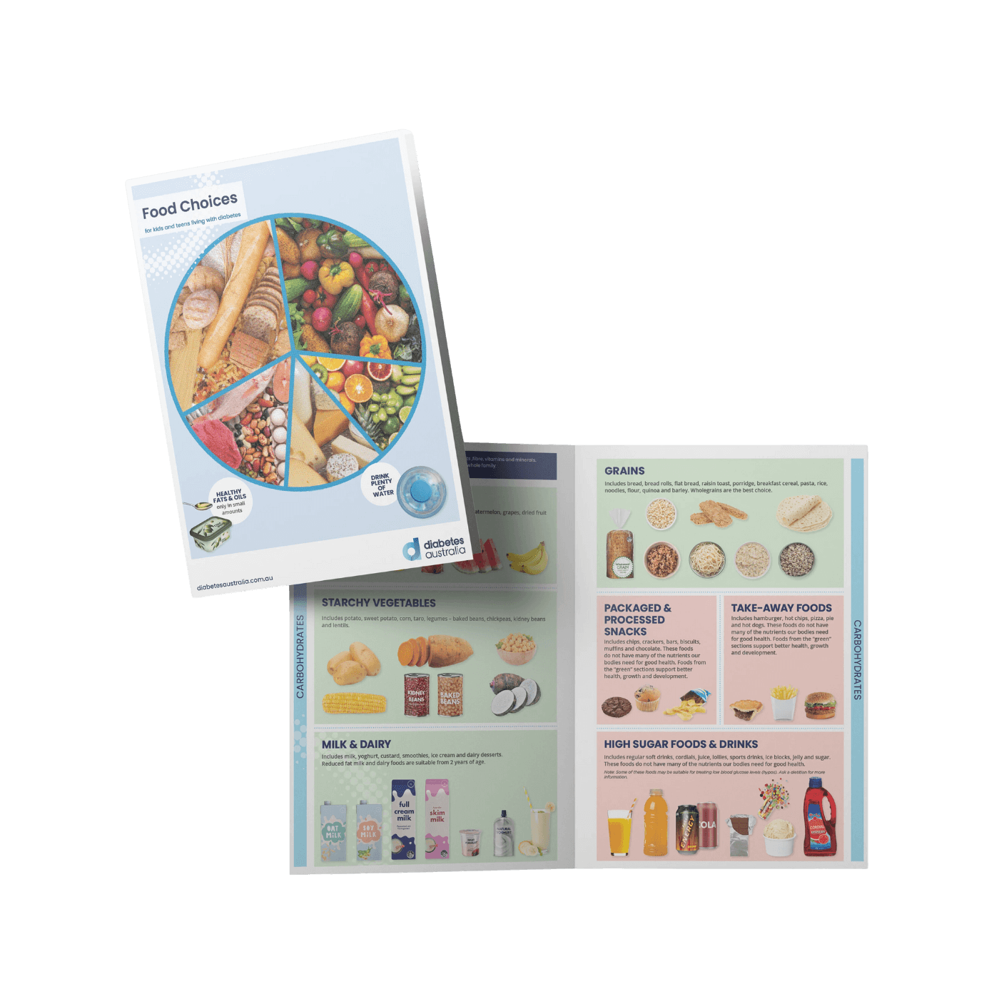 - Inside pages focus on carbohydrate-rich foods, those that are nutrient dense and those less so, colour-coded to denote the difference