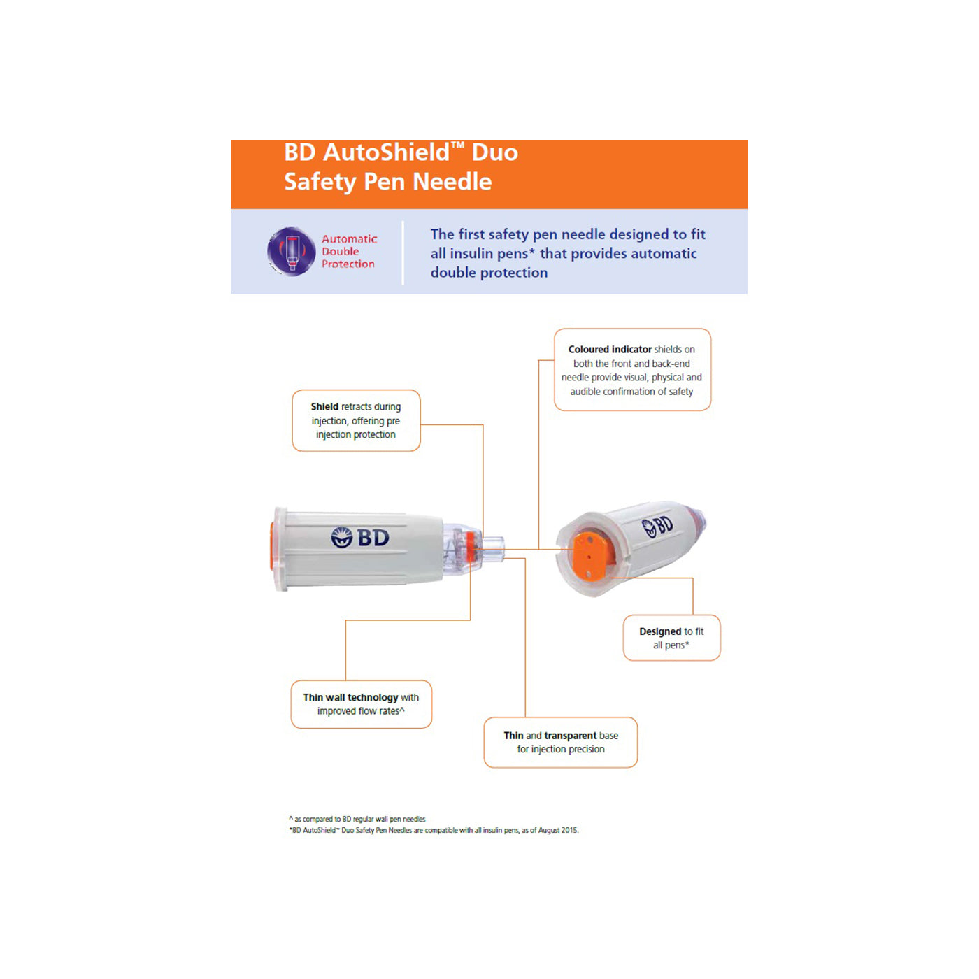 The BD AutoShield Duo pen needle is compatible with leading diabetes medication pens and features patented automatic dual-protection shields on both ends of the needle to help prevent needlestick exposure and injury during injection and disposal.