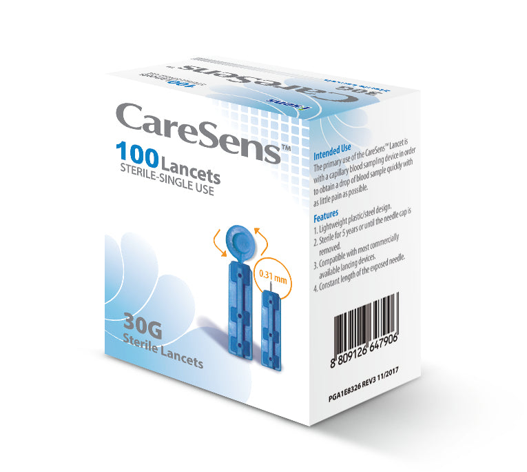 CareSens 30G Lancets have been specifically designed to reduce discomfort felt during blood glucose testing. The 30 gauge lancet has a tri-bevel tip and is finer than a 28 gauge lancet. The result is a less painful insertion with a reduction in tissue damage.