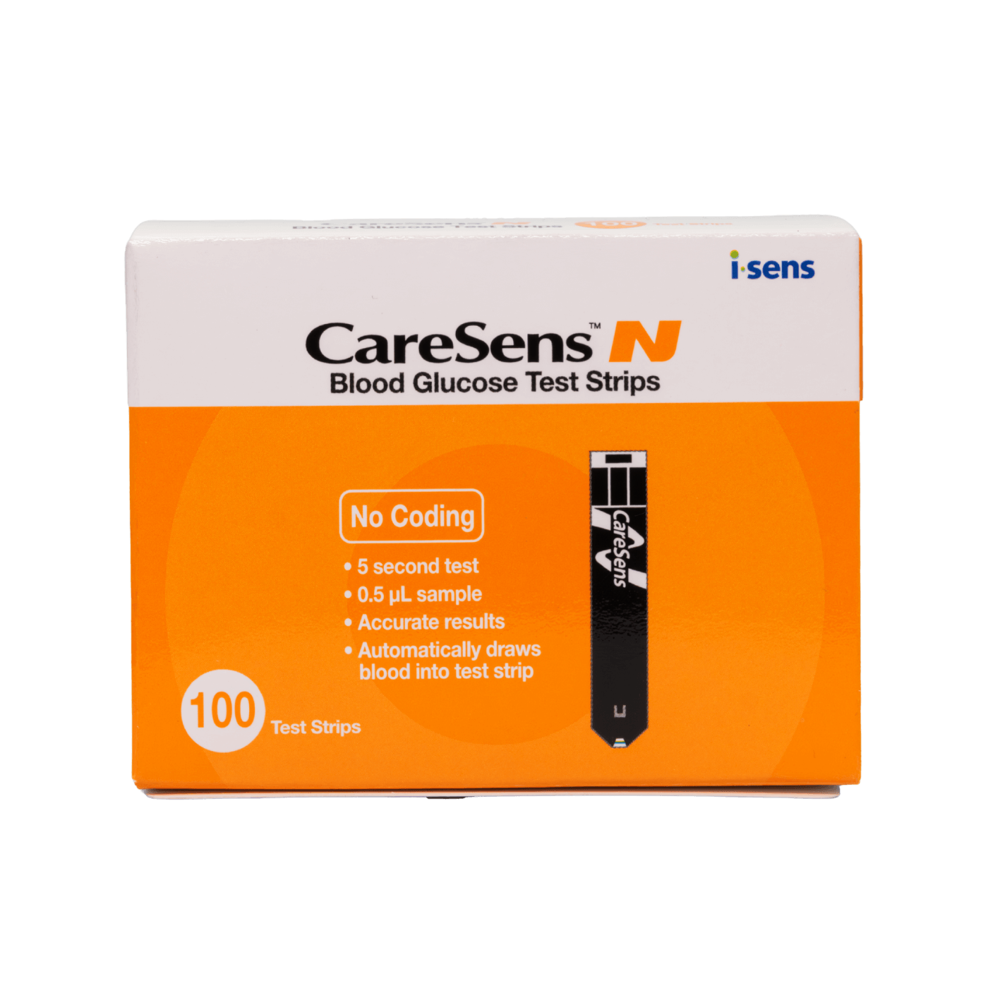 The CareSens N Blood Glucose Test Strips can be used with the CareSens N, CareSens N POP and CareSens N Premier monitors. These strips don’t require coding, just insert the strip into the monitor and it is ready to use. CareSens N test strips come in a pack of 100.