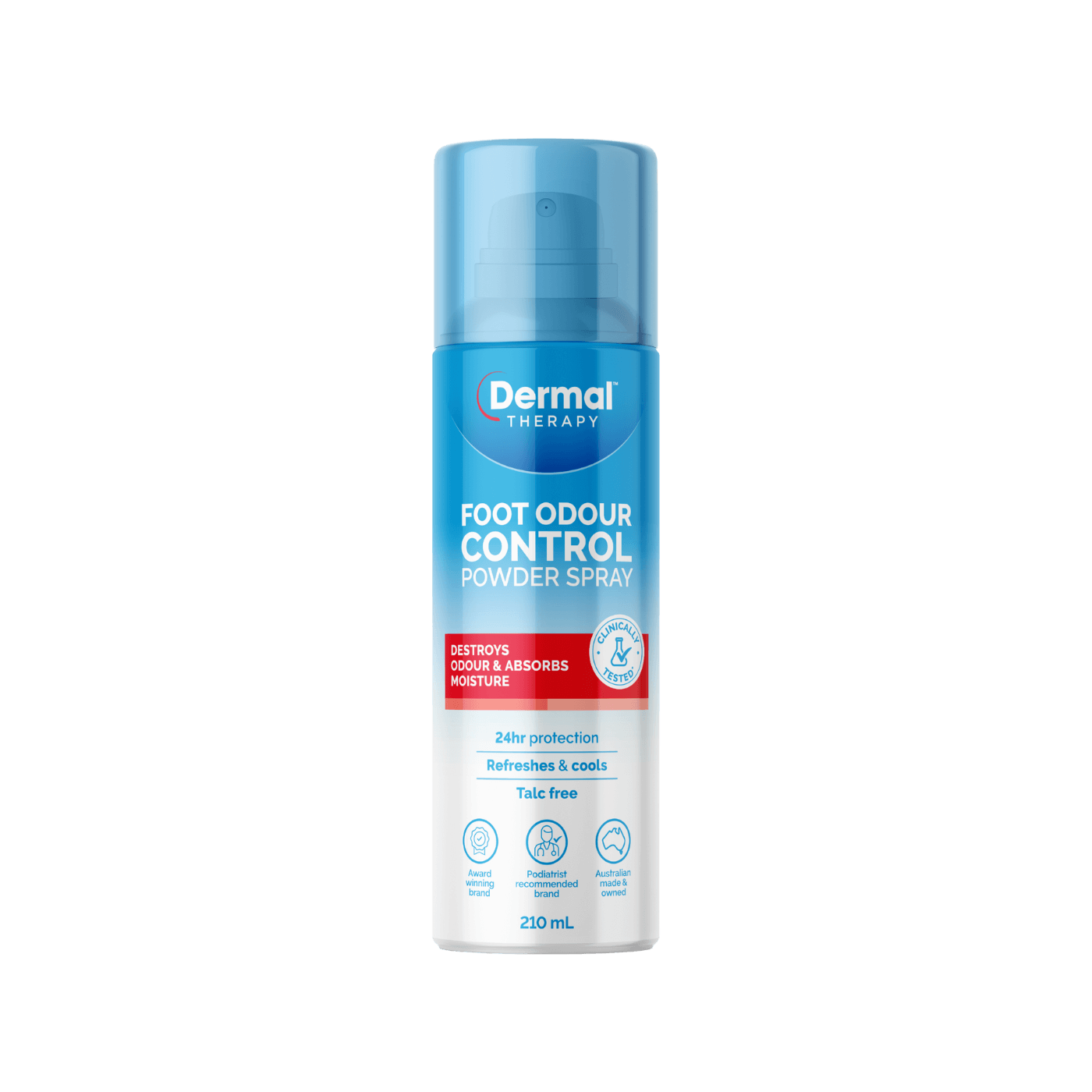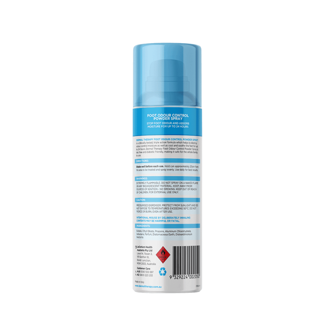 Dermal Therapy Foot Odour Control Powder Spray presents an effective, clinically tested way to control unwanted foot odour. This triple action formula destroys odour, absorbs moisture, and cools and soothes the feet for up to 24 hours. This powder spray is also talc free and diabetes friendly, making it safe for the whole family to use.