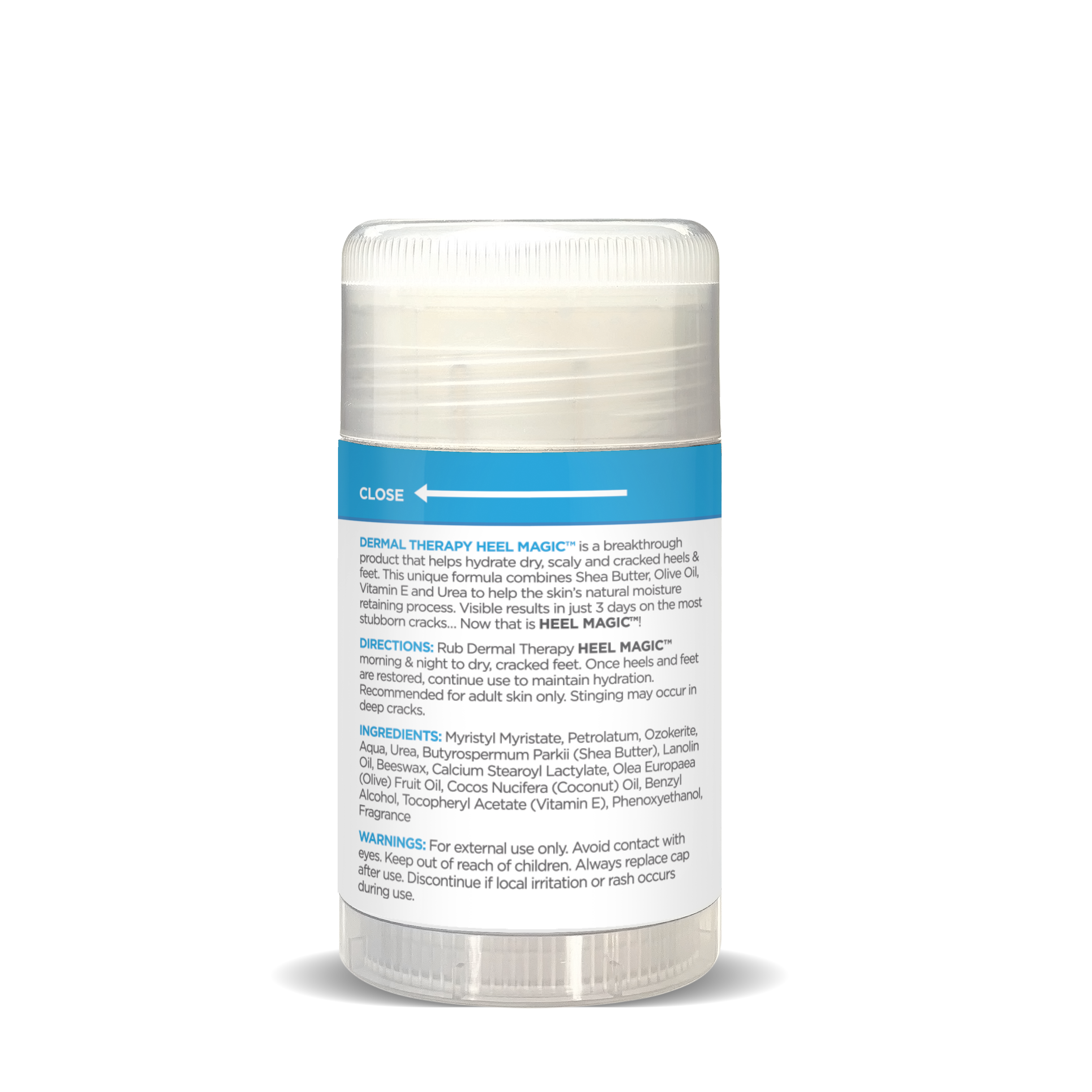 Rub Dermal Therapy Heel Magic morning and night to dry, cracked feet. Once heels and feet are restored, continue use to maintain hydration.