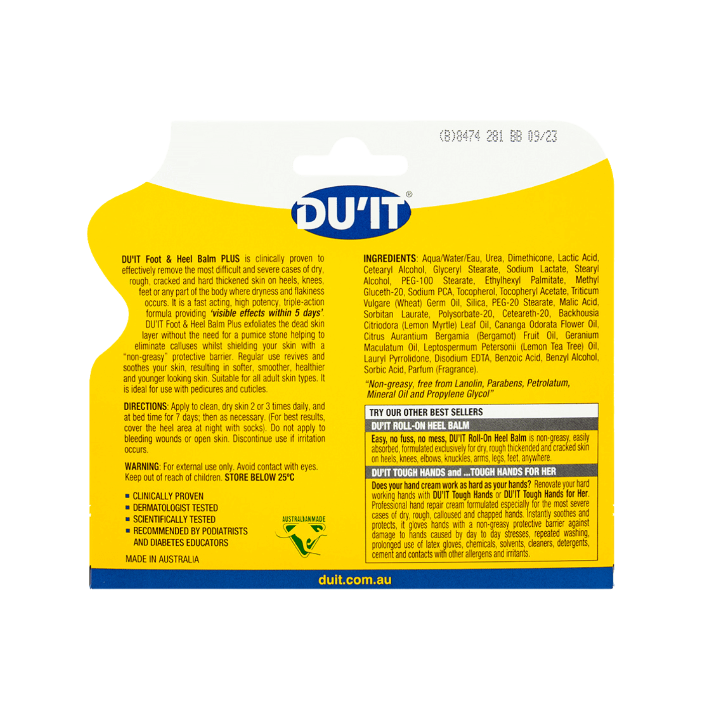 DU'IT Foot & Heel Balm Plus is an intensive heel balm formula containing 25% urea that helps repair cracked, dry heels, providing visible effects within 1 day. It's clinically and dermatologically tested to effectively rehydrate, soften and protect feet, giving you soft, smooth, healthy feet.