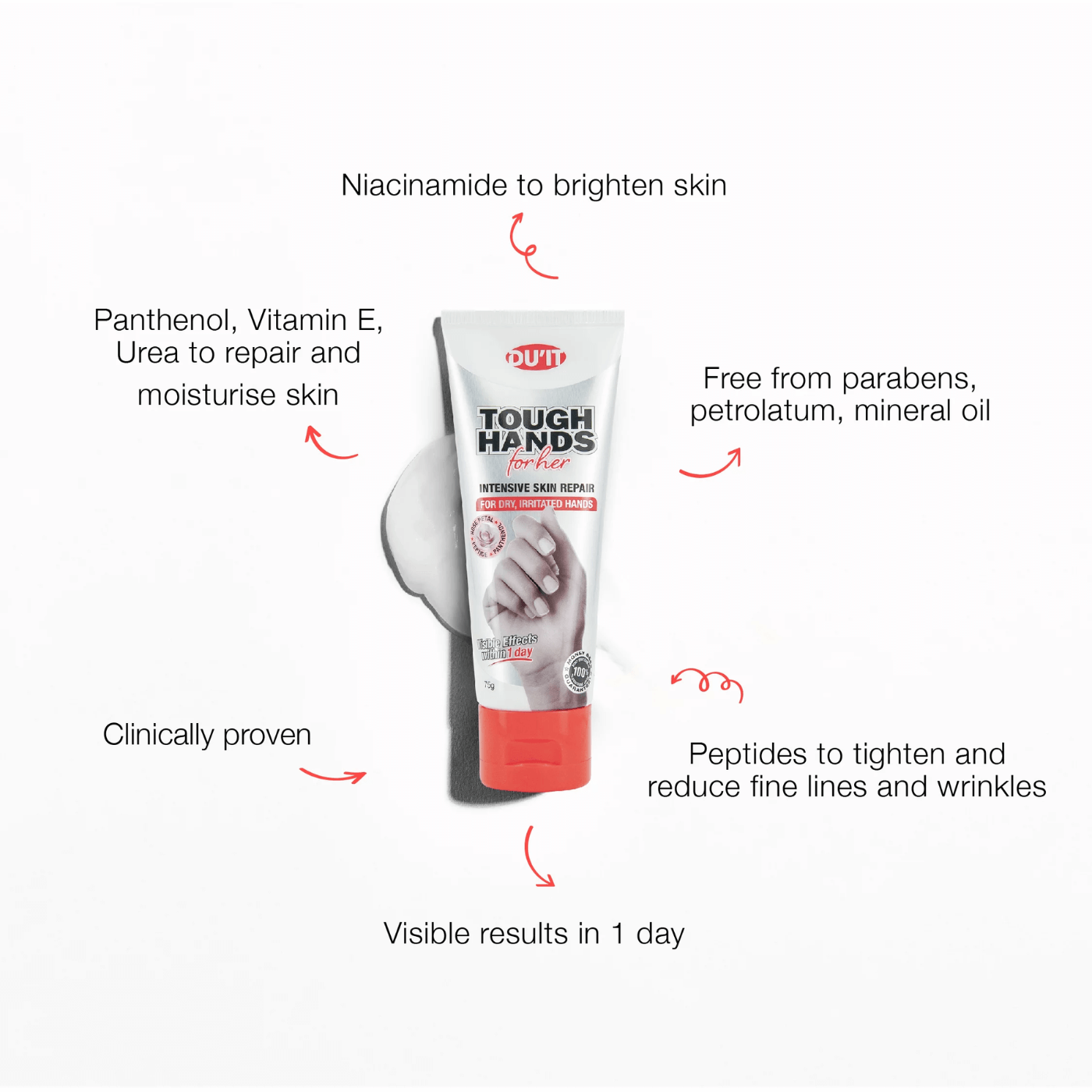 DU'IT Tough Hands for Her is a clinically tested, high-performance hand cream formulated to hydrate, restore and protect tired, dry, and overworked hands. Designed specifically for daily use, it helps to improve skin texture and appearance by supporting the skin's natural barrier and locking in moisture.