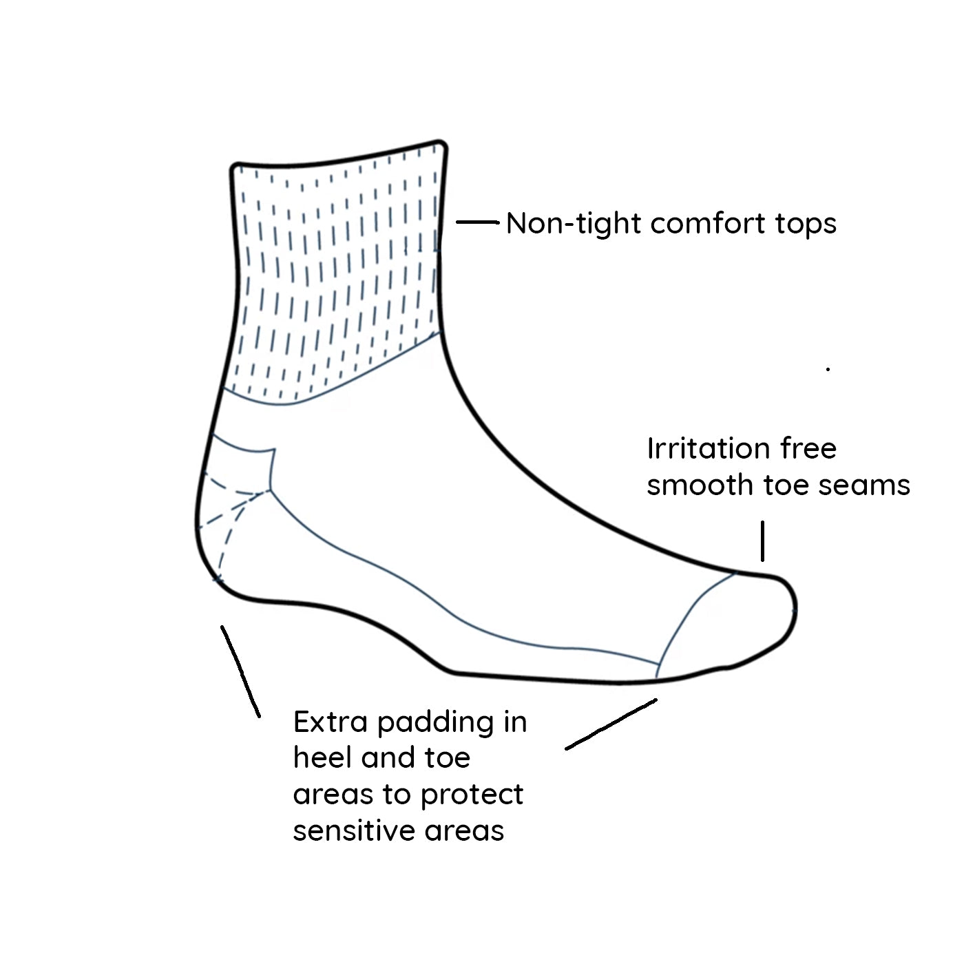 They feature non-tight tops that stay up without the painful grip of conventional elastic tops with comfort seams to prevent irritation and abrasions. Extra padding adds an additional layer of comfort focusing on the heels and toes while still maintaining their slim design.