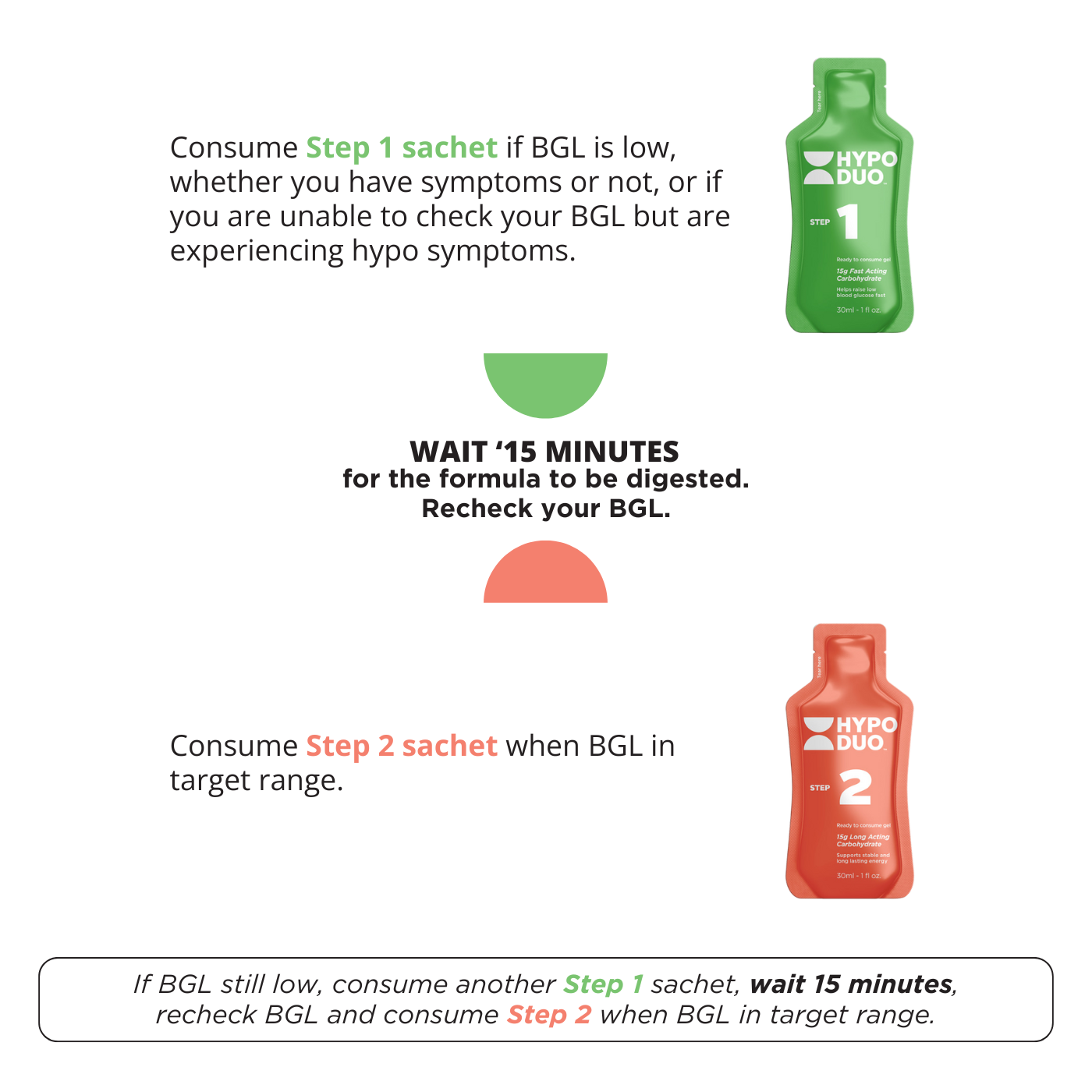 - Consume Step 1 sachet if your blood glucose level (BGL) is low or if experiencing hypo symptoms