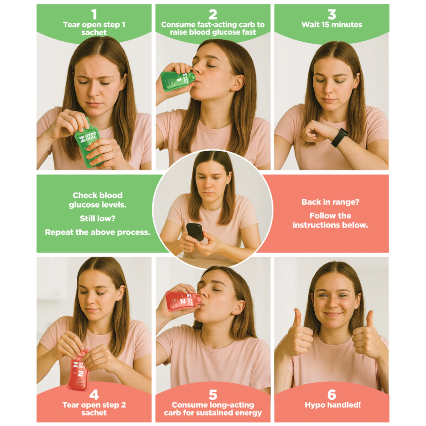 HYPO DUO is a clinically designed two-step carbohydrate gel system formulated to support the effective management of mild hypoglycaemia. Each sachet is pre-dosed to deliver a precise amount of carbohydrate, helping to raise and stabilise blood glucose levels without the risk of overtreatment or rebound hypoglycaemia.