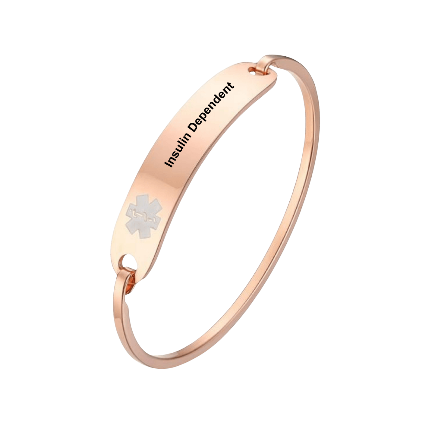 This medi-alert bracelet is engraved with "Insulin Dependent" and can provide critical information to first responders and health professionals in an emergency, to ensure they can provide the appropriate care.