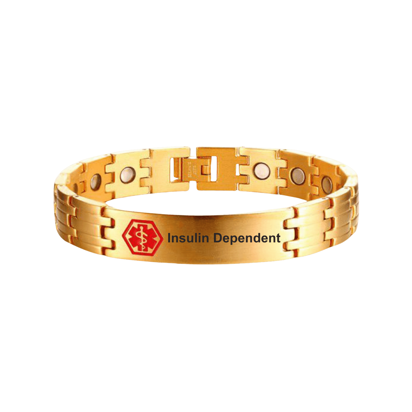 This medi-alert bracelet is engraved with "Insulin Dependent" and can provide critical information to first responders and health professionals in an emergency, to ensure they can provide the appropriate care.