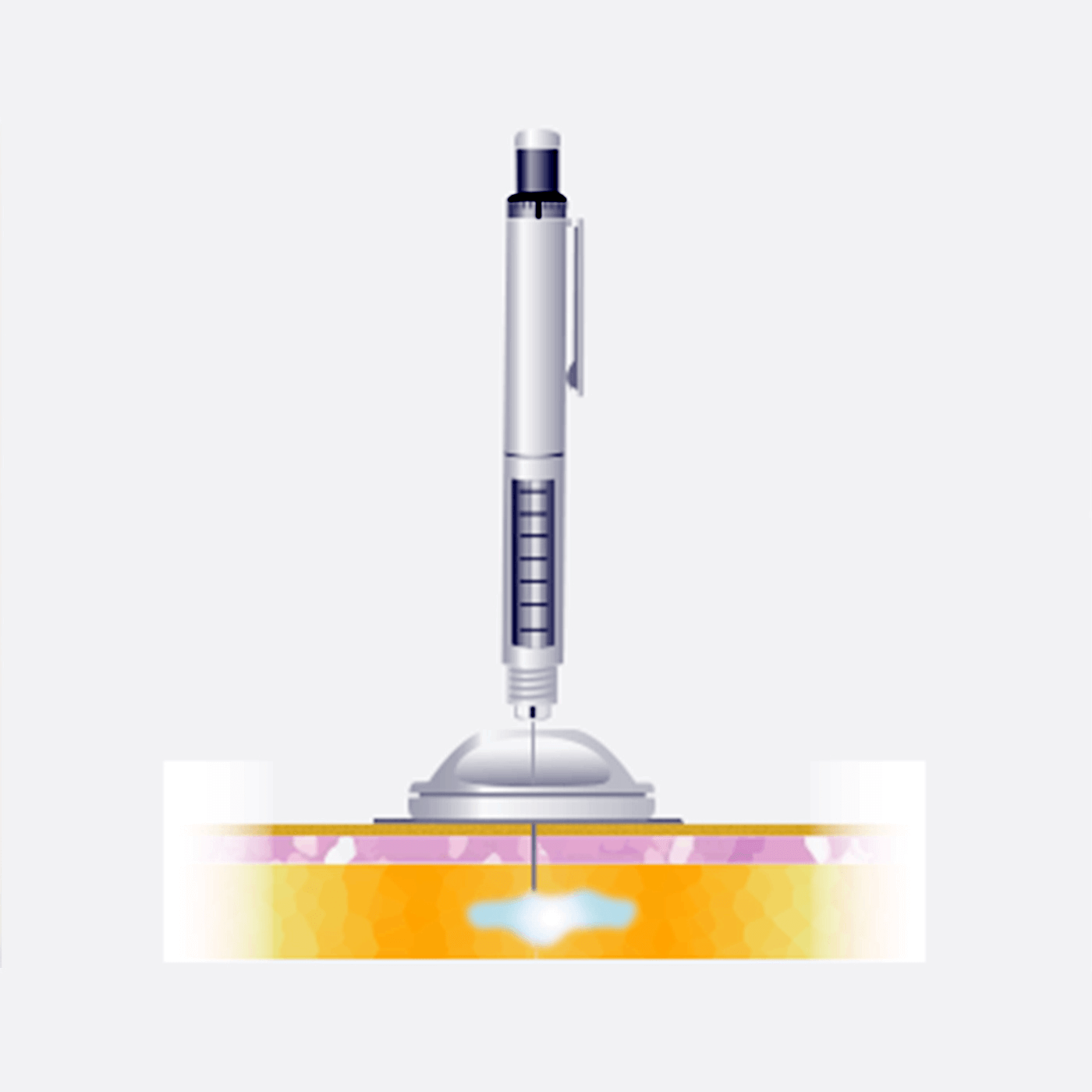 - Press down on center of inserter to secure injection port to skin.