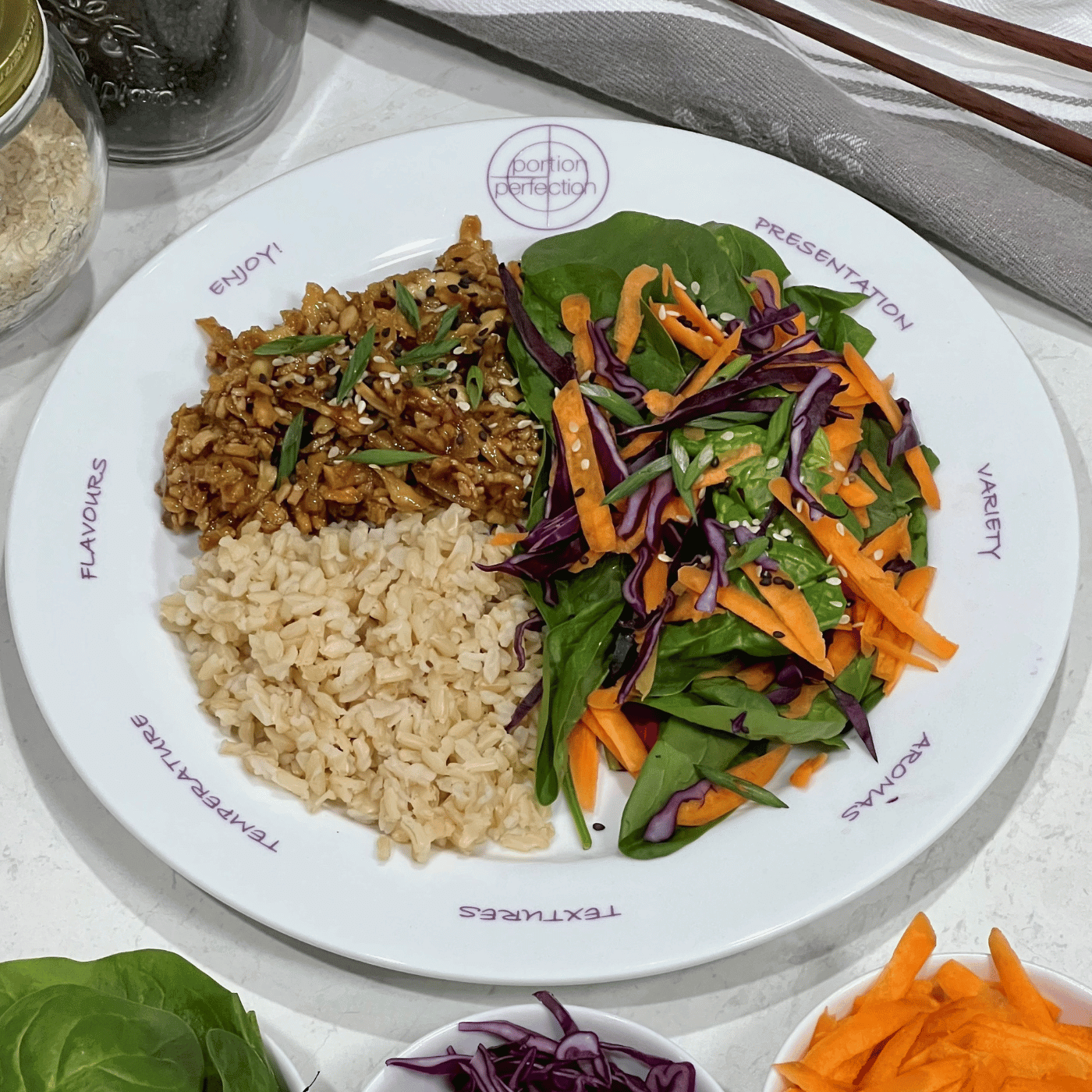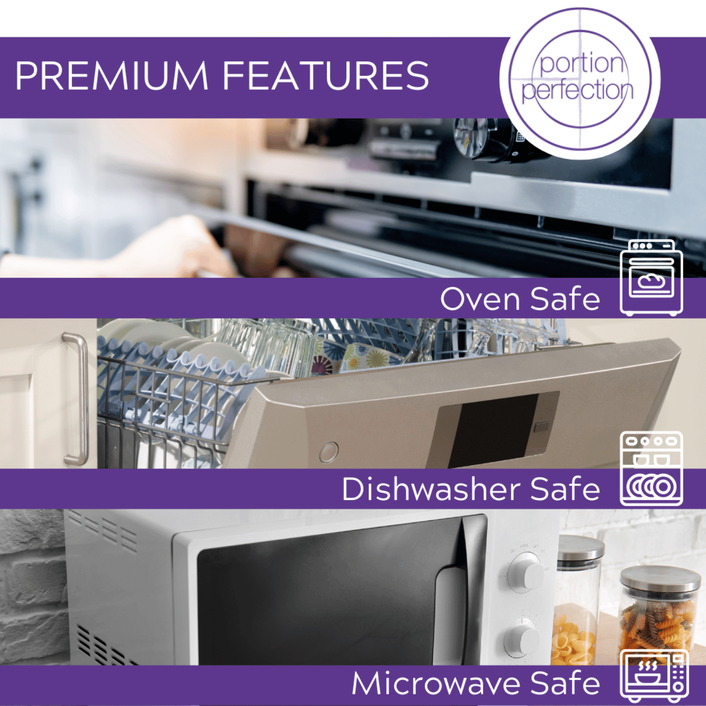 The Portion Perfection Plate holds a measured portion and is a practical tool for men, women and children. The plate shows markings to guide the type of food to make up a main meal and the words around the plate relate to conscious eating which is a strategy for feeling satisfied on the smaller portion.