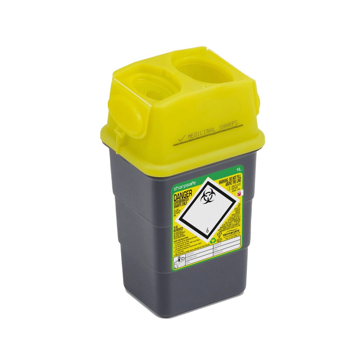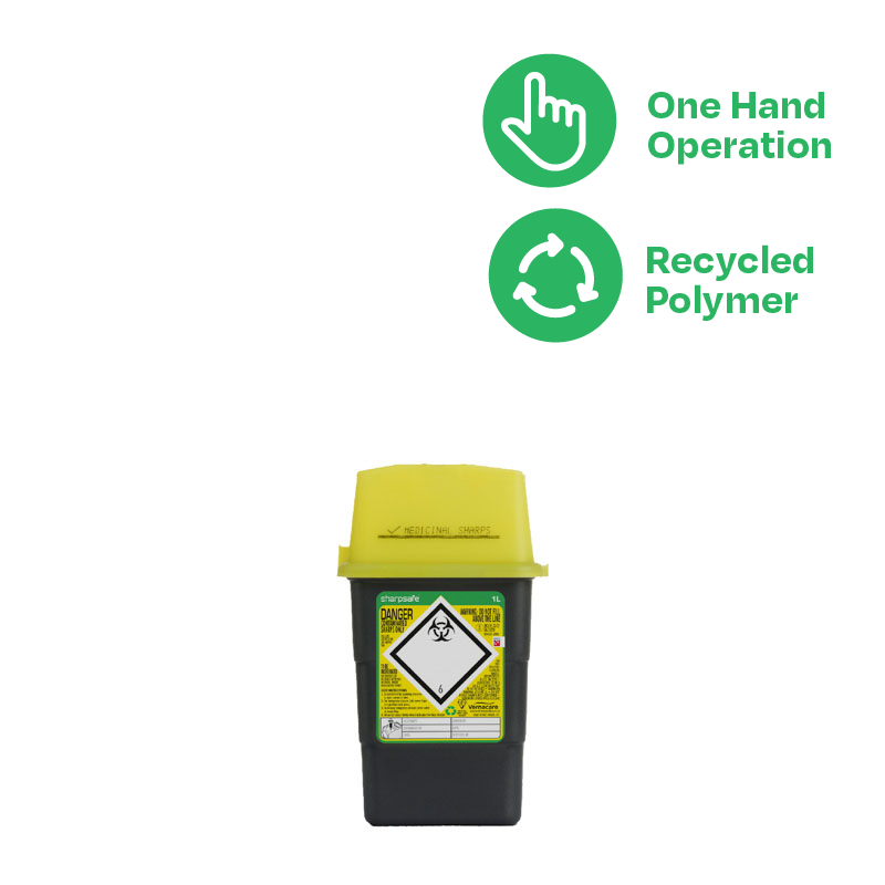 The Sharpsafe 1 Litre container offers a safe, eco-friendly solution for disposing of clinical sharps, reducing the risk of injuries. This container is perfect for both hospital and community use. Its dual-aperture design includes an open section for general disposal and a needle removal feature, enhancing safety and convenience.