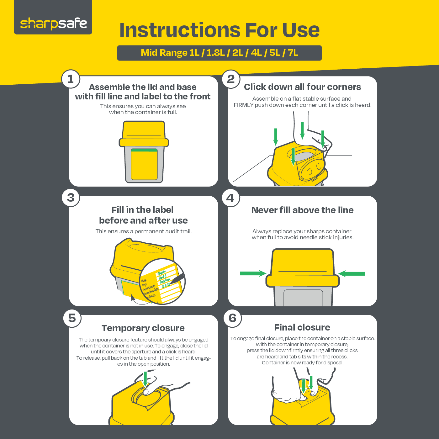 Made from low-carbon recycled polypropylene, Sharpsafe's 5th Generation containers showcase a commitment to sustainability. The container holds approximately 30 syringes (1cc) and is easy to assemble with a secure lid offering temporary and permanent closure options.