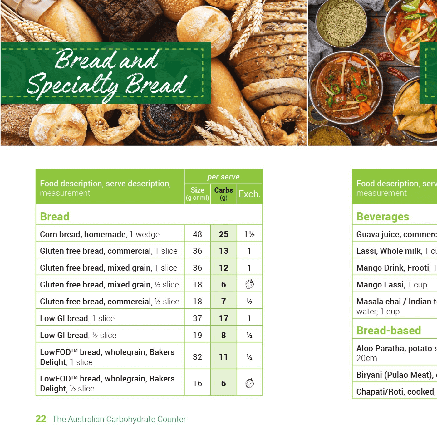 The comprehensive carbohydrate exchange list in this book covers many common foods enjoyed in Australia including Chinese, Indian, Korean, Italian, Japanese, Greek and Middle Eastern foods.