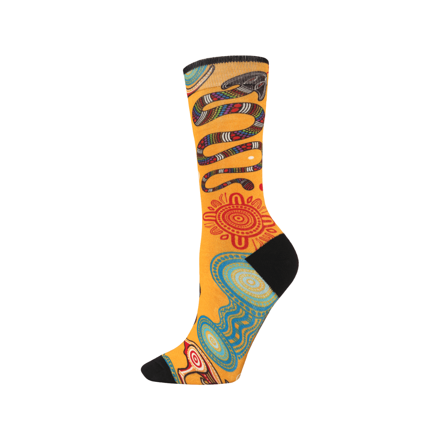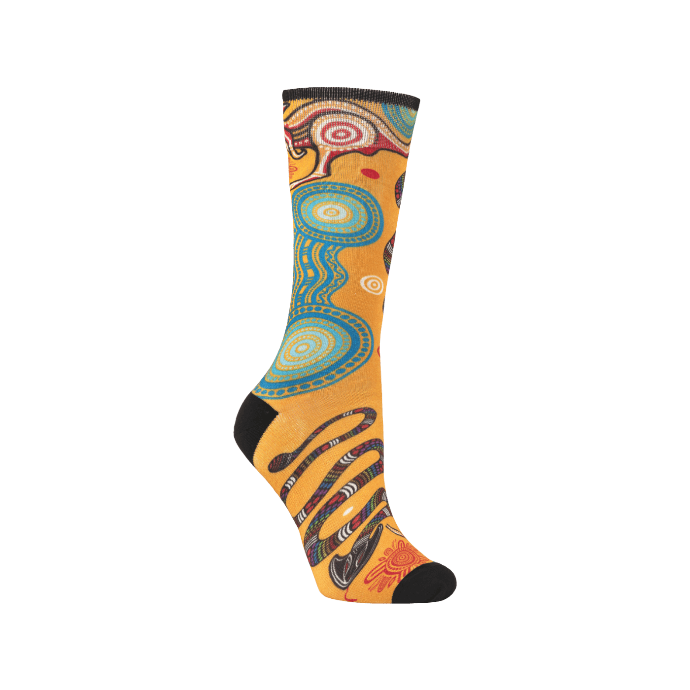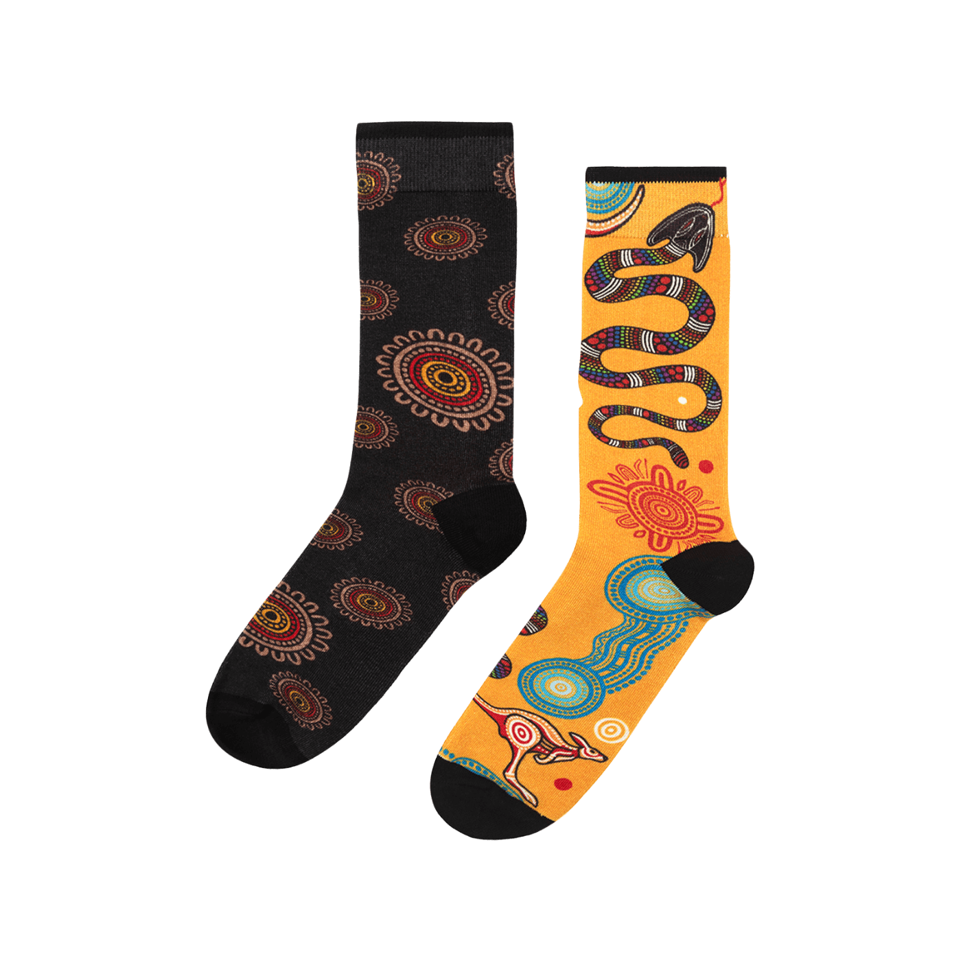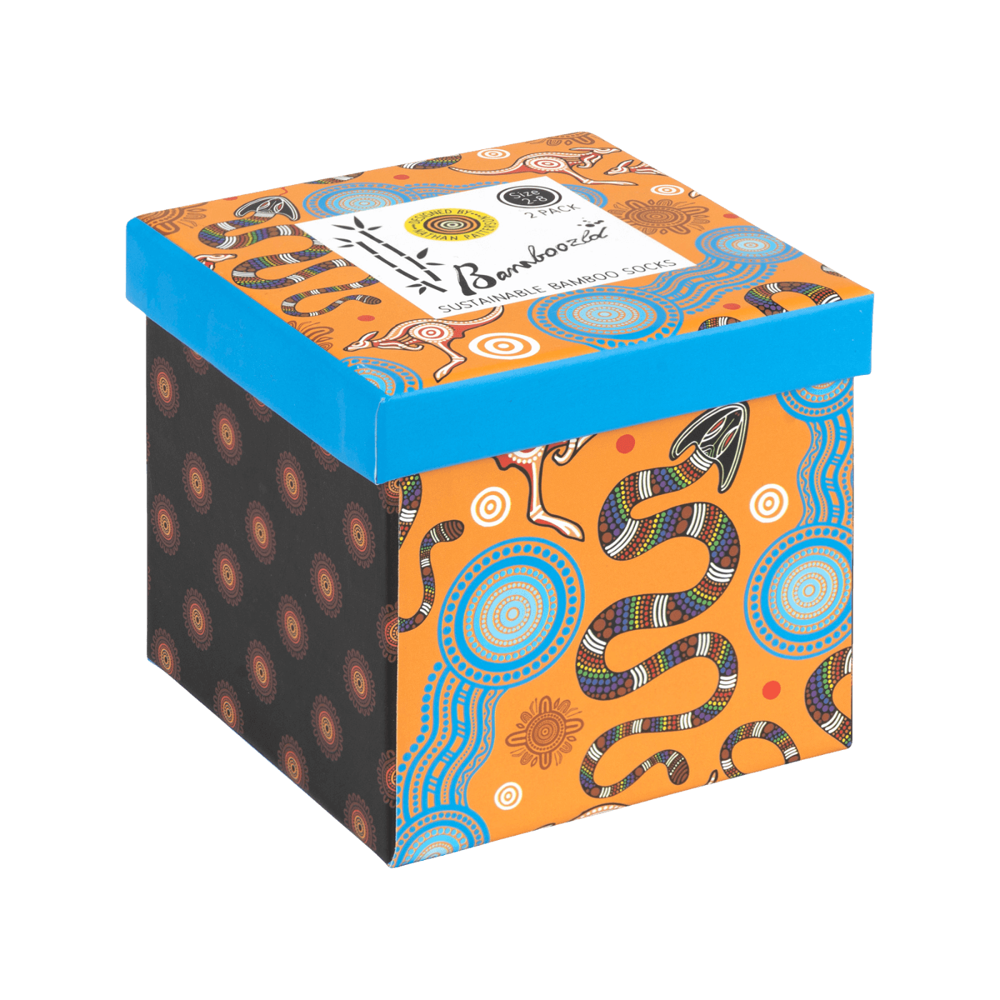 Designed in collaboration with contemporary Indigenous artist, Nathan Patterson, the Australian Dreamtime Gift Box of signature bamboo blend socks features Campfire and Rainbow Serpent designs, packaged in a stylish matching gift box.
